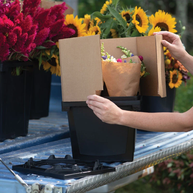 An all-in-one flower harvest, transport, and display system that provides optimal conditions for cut flowers on each leg of their journey. The main components of the Procona System are: 1) a plastic container that can be filled with water and flowers; 2) a cardboard collar for increasing height and protecting blooms during transport; 3) and a ventilated lid that provides a stable base for the next row of stacked containers. The small container footprint allows for high loading capacity, and the side and top ventilation allows all flowers to receive adequate air flow to stay fresher longer. Once flowers arrive at market, simply remove collars and lids for a beautiful display. A variety of sizes and collar heights in two Procona Series (Florida and Valencia) are available to accommodate different flower sizes and stem lengths. Procona containers can also be topped with lids to create professional, reusable vegetable CSA boxes.
