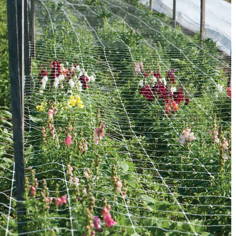 Horizontal trellis for supporting long stems in cut flower cultivation.