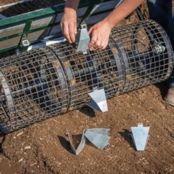 The perfect complement to precision seeders and mechanical harvesters. The heavy-duty lobster trap wire (which covers one solid, cylindrical roller) has a 1″ trap wire mesh, spaced close enough to break up smaller clumps and dirt clods but wide enough to resist getting clogged with soil and mud. The roller can also be used post-seeding to press seed firmly into contact with the soil for improved germination rates; the trap wire mesh also creates a pattern of uniformly spaced mini-furrows that help retain essential moisture and resist erosion from wind, rain, and irrigation — unlike turf rollers, which create a completely smooth surface that is easily eroded. May be pulled or pushed. Handle is adjustable laterally to allow operation in-row or from either footpath. A metal rack on top can accept additional weight if needed. Developed in conjunction with Eliot Coleman. Made in Maine. One solid roller, 48″ wide.