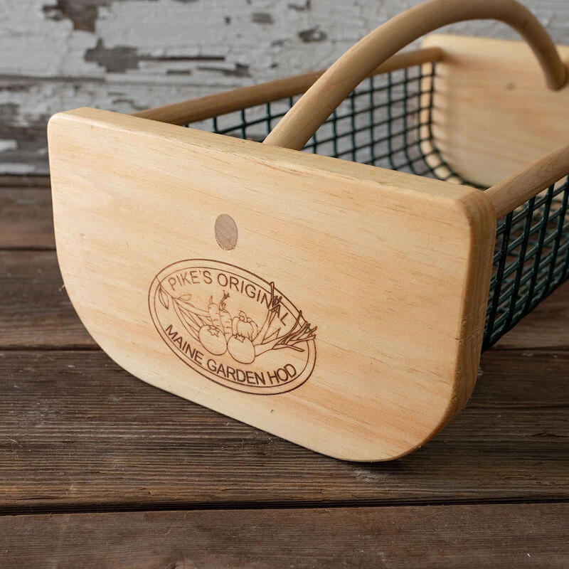 Originally used by New England clammers, the garden hod allows for harvesting and washing plants, fruits, and vegetables all in the same basket. Spray your harvest with a hose or dunk the whole hod in a larger container of water for most effective rinsing. Crafted in Maine with pine ends, birch dowels, a steam-bent oak handle and the same lobster trap wire as our compost bin – a durable stainless steel mesh, covered with food-grade vinyl. Weather resistant, hand-rubbed oil finish. Hundreds of other uses – both inside and out. Makes a great gift any time of the year. Holds 1 peck (8 quarts), basket is 16″L x 9″W x 5 1/4″ deep.